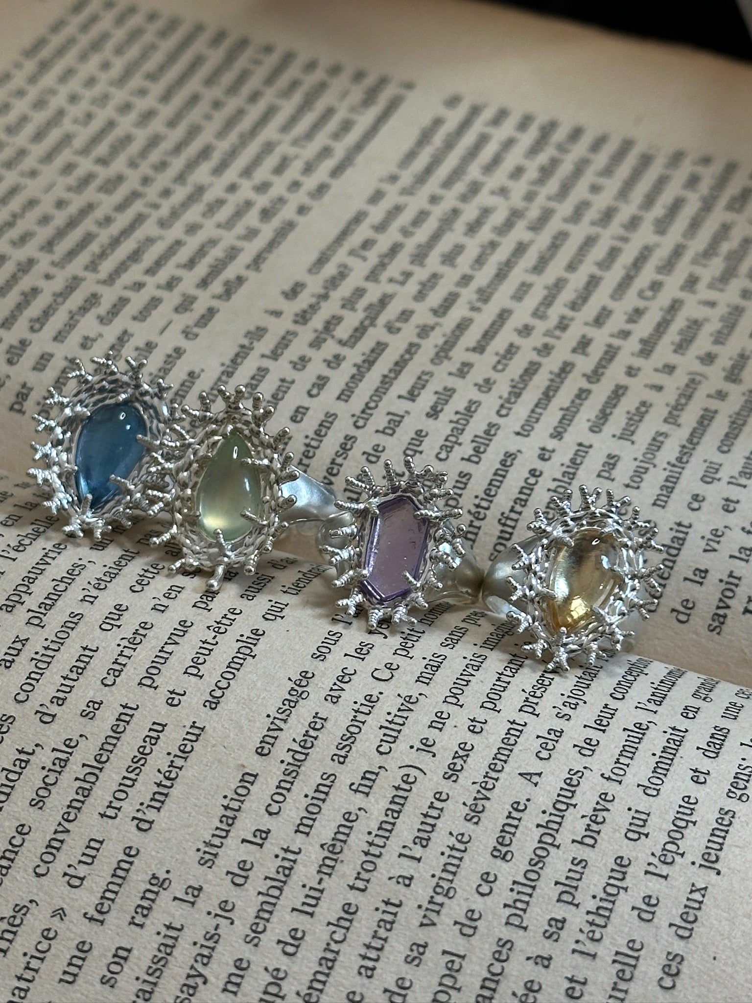 The Aetheris collection is handcrafted in sterling silver, embracing three natural gemstones: citrine, aquamarine, and amethyst. The silver setting resembles a radiant crown of starlight, while each gemstone embodies a facet of the heavens: