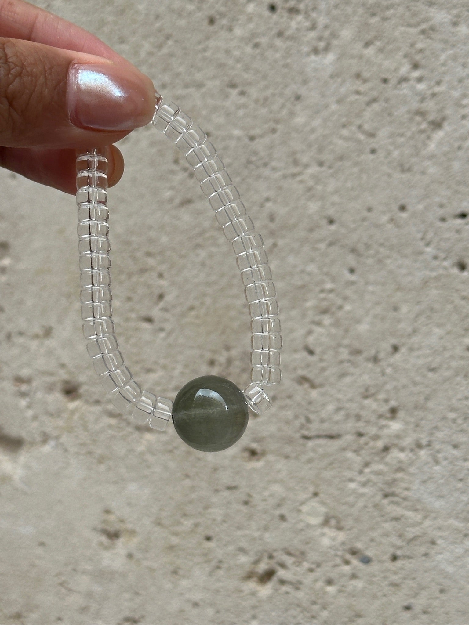 Aurevine is a handcrafted bracelet that captures the quiet dialogue between clarity and nature. Featuring pan-cut clear quartz, celebrated for its purity and balancing energy, combined with a single high-quality green rutilated quartz, the design reflects the vitality of nature woven into crystalline light.