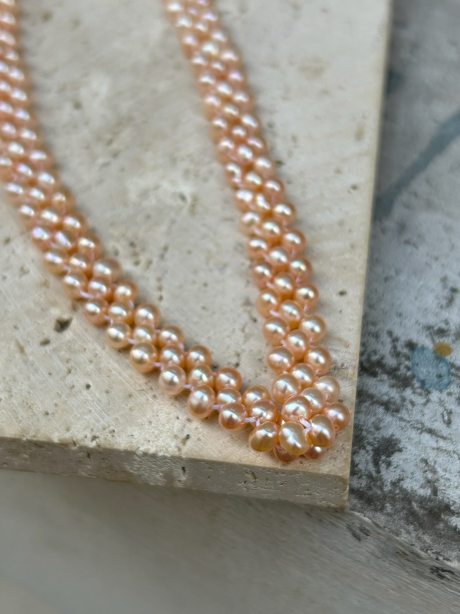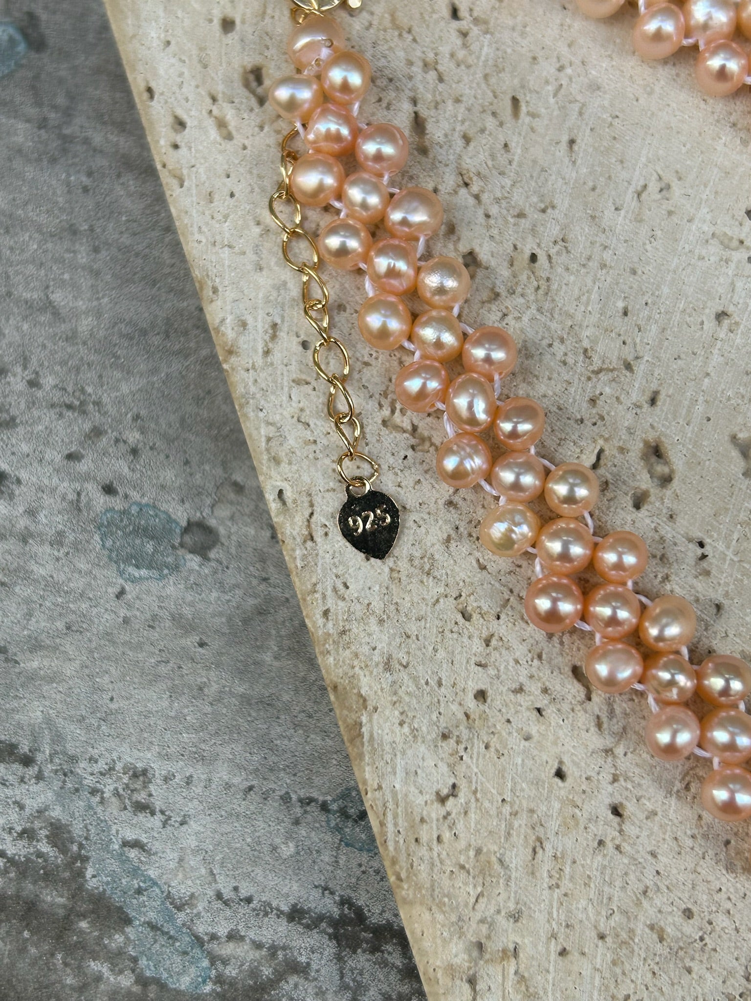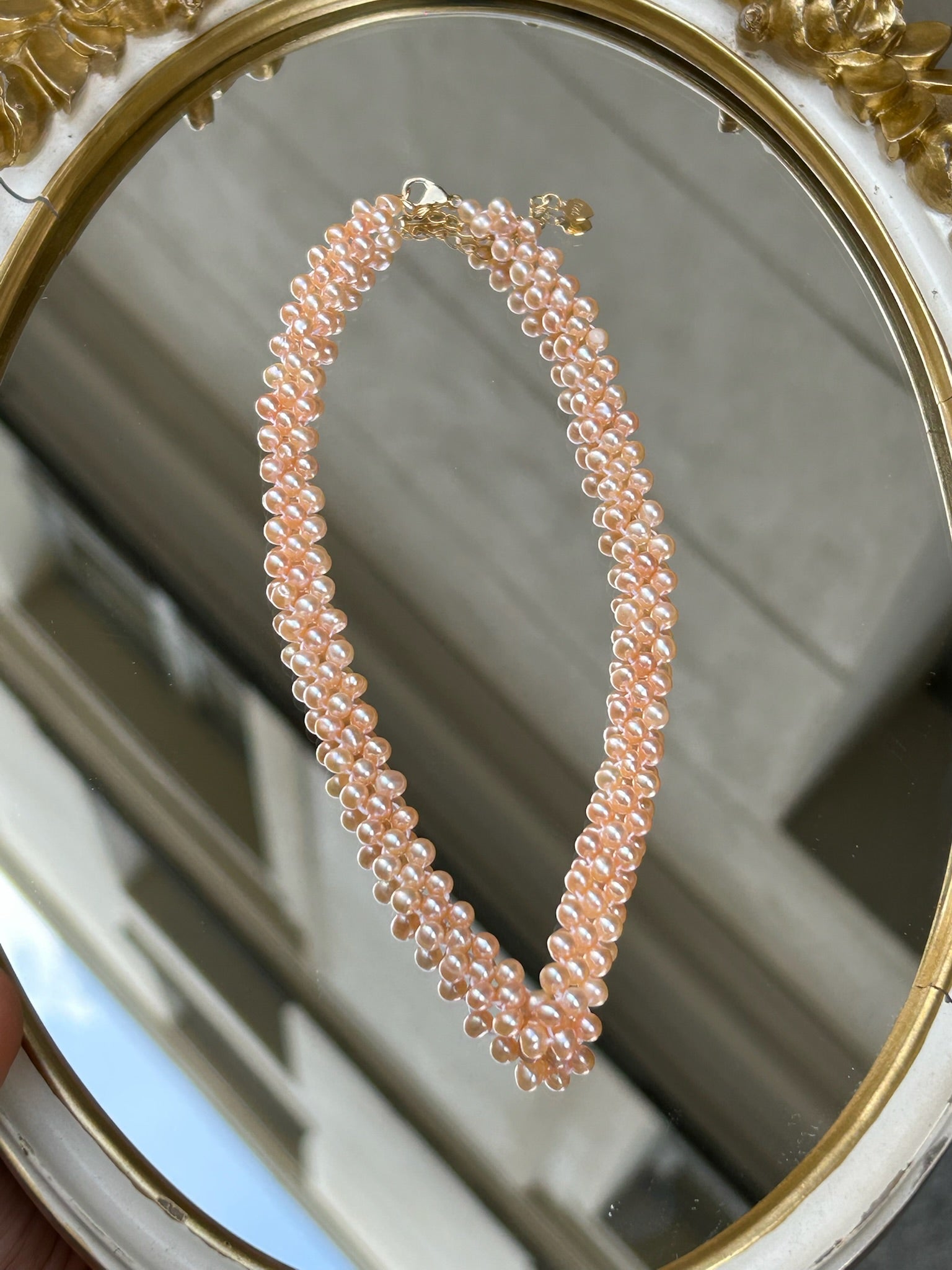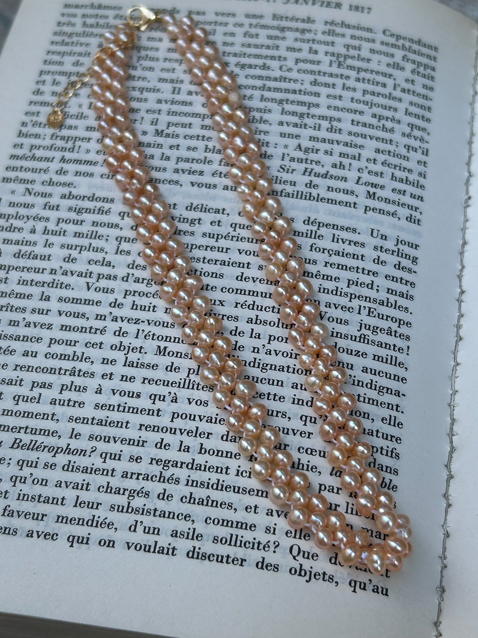 Graceful and romantic, the Rosé Weave necklace captures the delicate warmth of freshwater pearls in soft blush tones. Handwoven with meticulous craftsmanship, each pearl is interlaced to form a luminous tapestry, highlighting both texture and natural iridescence. Completed with an adjustable S925 sterling silver clasp, Rosé Weave combines refined artistry with versatility, making it a timeless piece for both everyday elegance and evening allure.
