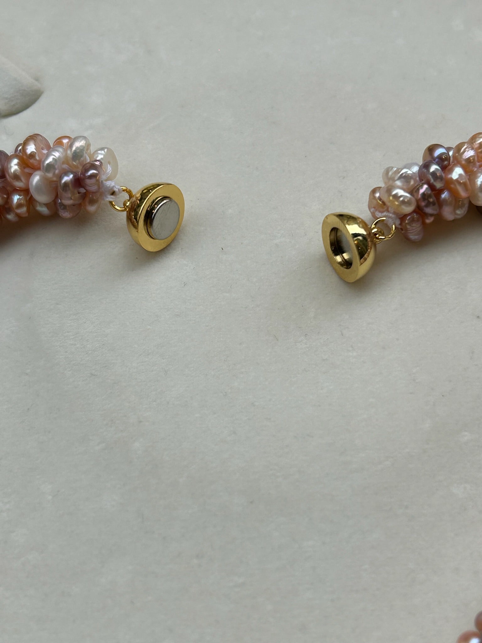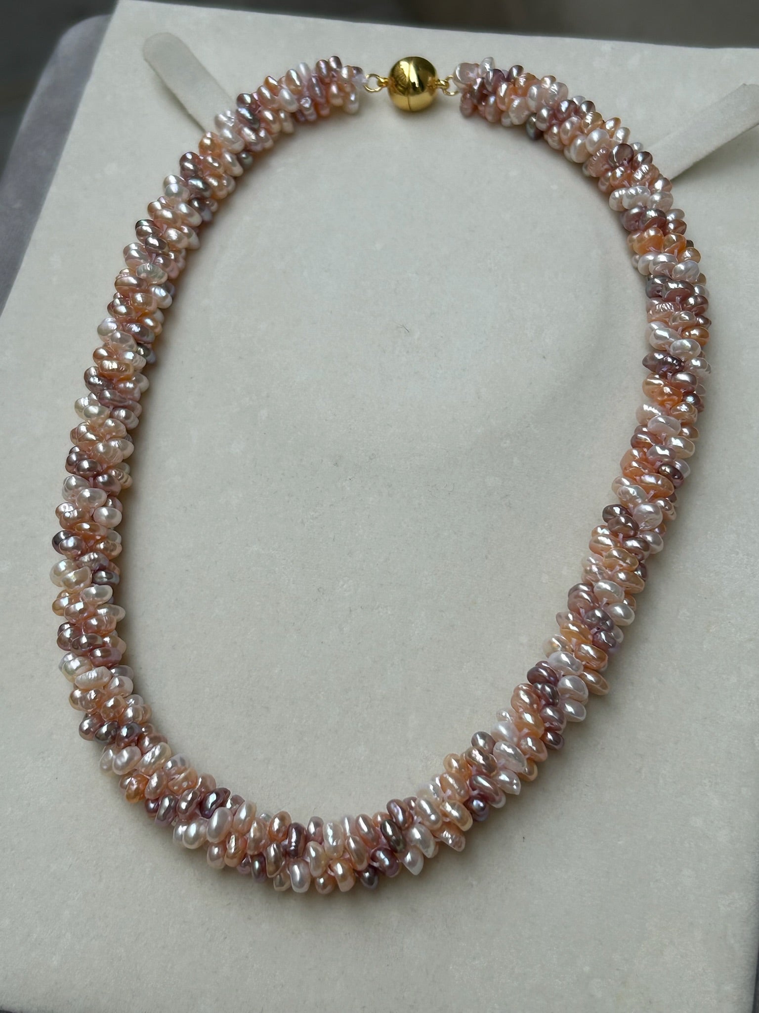 Iridesca is a handcrafted necklace that celebrates the natural beauty of color and light. Woven from lustrous multicolor freshwater pearls, each bead reflects unique iridescent hues, creating a dynamic interplay of soft pinks, champagne tones, and warm bronzes. The design is finished with a refined 925 sterling silver clasp, ensuring both durability and timeless elegance.