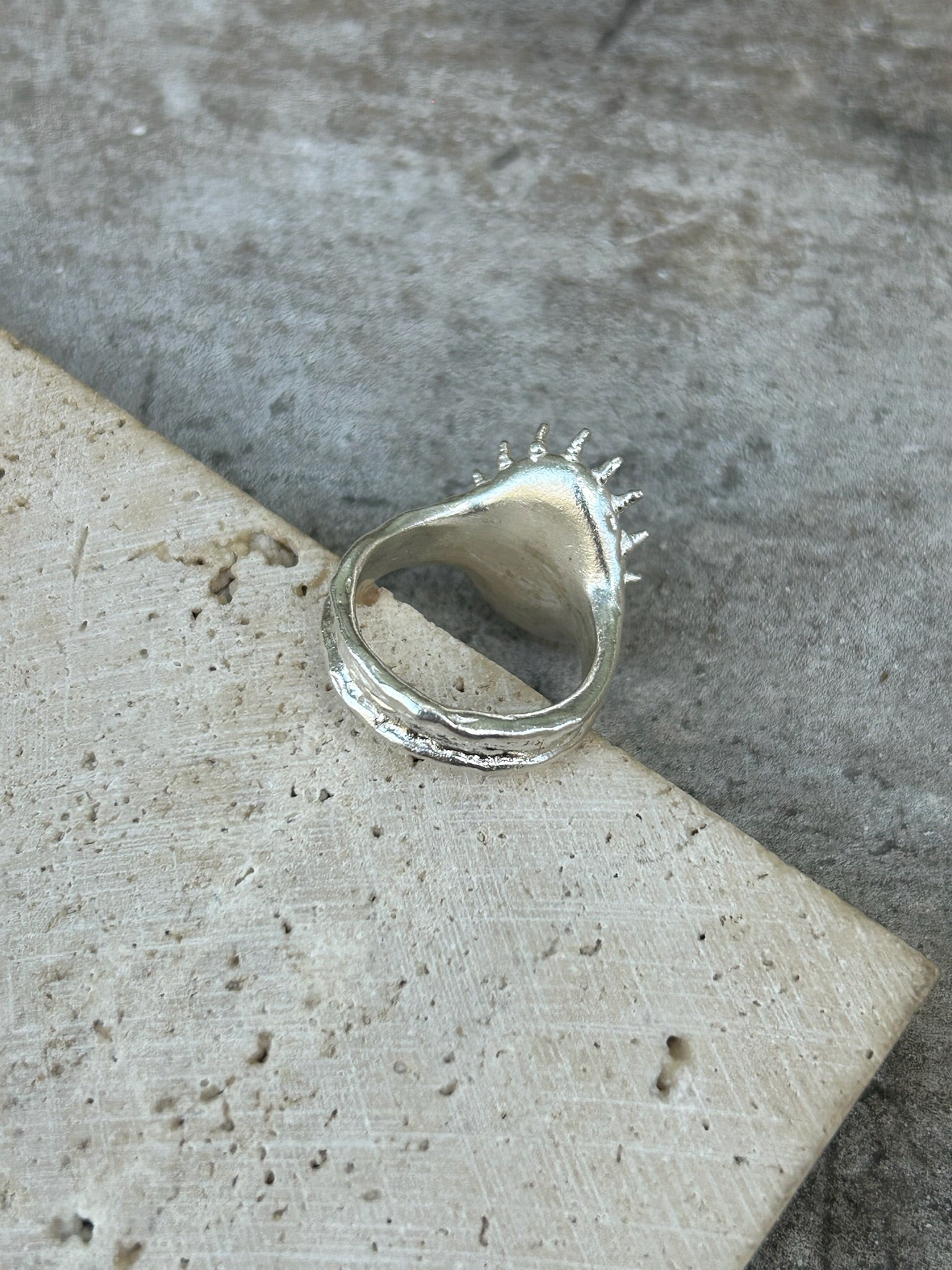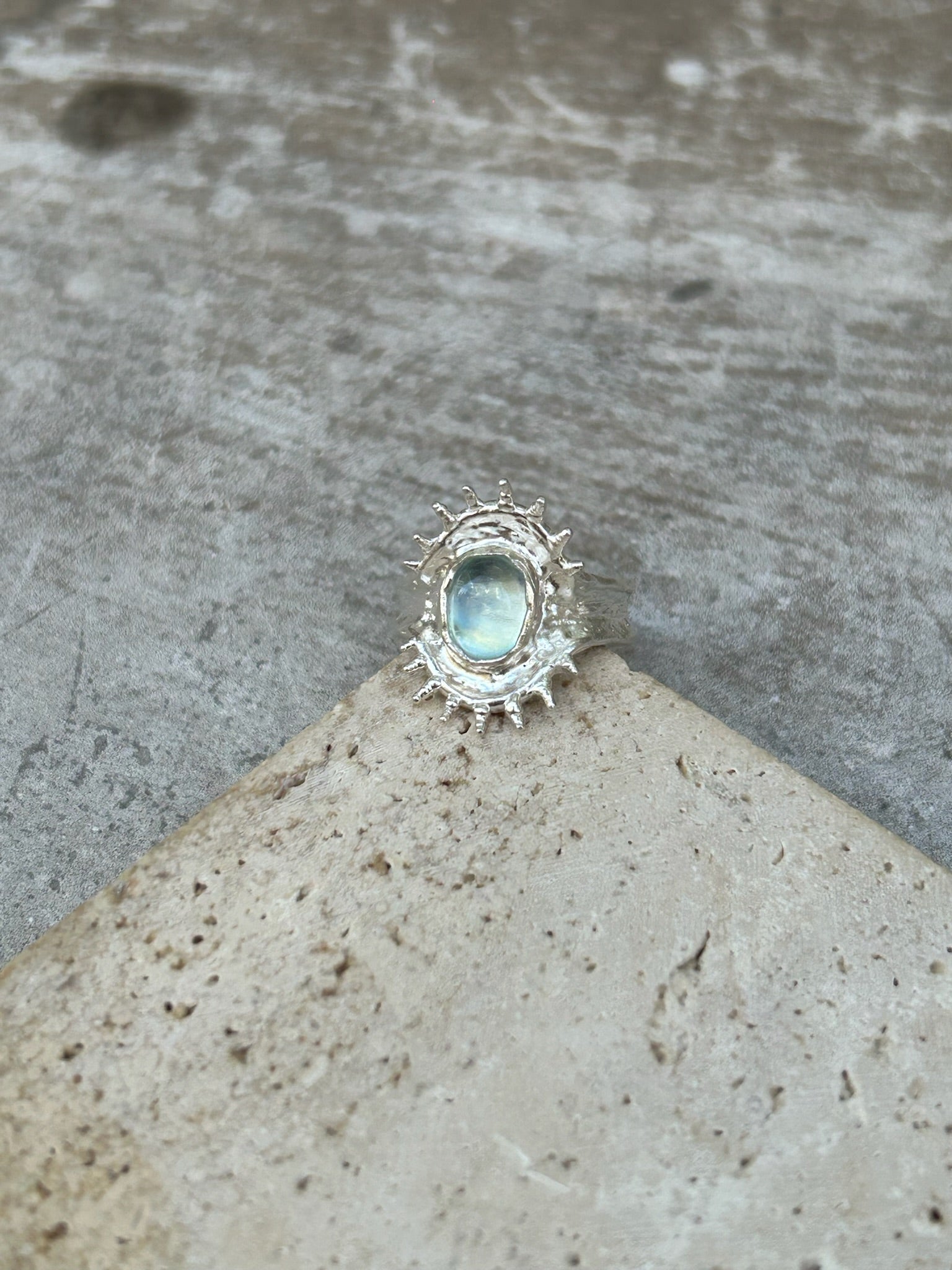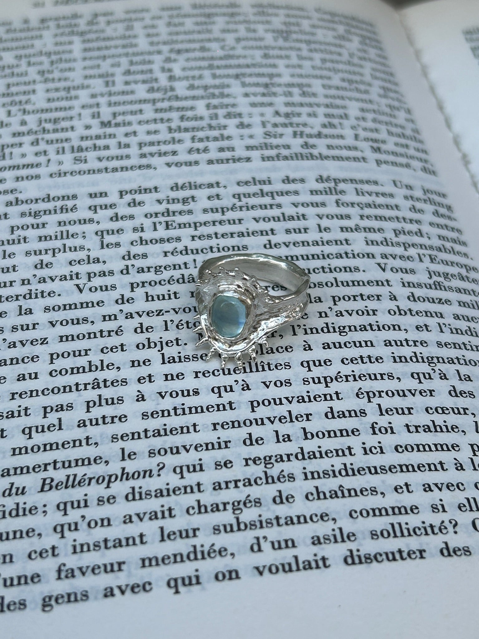 Oceira is a handcrafted ring that embodies the serene spirit of the sea. Centered with a natural Aquamarine gemstone, its tranquil blue glow reflects the clarity of ocean waters and the calmness of gentle waves. The organic 925 sterling silverband complements the stone’s purity, adding an artisanal touch to its timeless elegance.