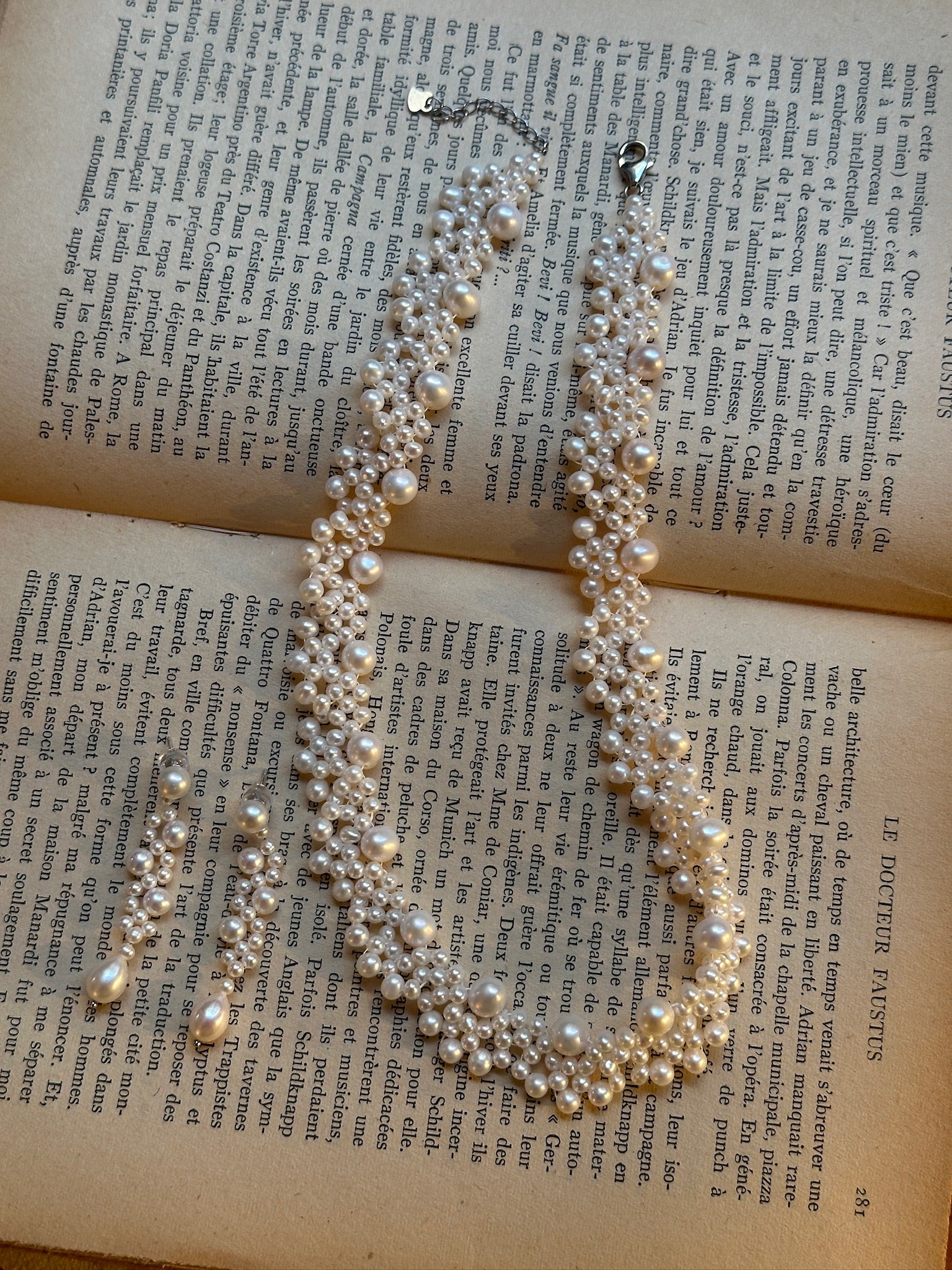 The intricate weaving technique creates a delicate interplay of light and texture, while the natural pearls radiate a soft, angelic glow—an adornment worthy of both modern soirées and treasured heirlooms.